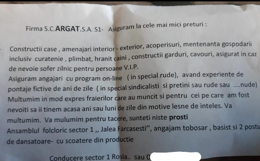 Construcții case, amenajări interior – exterior, acoperișuri, mentenanță gospodării, inclusiv curățenie, plimbat, hrănit câini, construcții garduri, cavouri, asigurat în caz de nevoie șofer zilnic pentru persoane VIP. Asigurăm angajări cu program online (în special rude), având experiență de pontaje fictive de ani de zile ( în special sindicaliști și ”pretini” sau rude… sau.. nude). Mulțumim în mod expres fraierilor care au muncit și pentru cei pe care am fost nevoiți să-i ținem acasă ani sau luni de zile din motive lesne de înțeles. Vă mulțumim. Vă mulțumim pentru tăcere, sunteți niște proști.