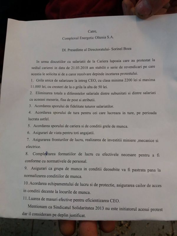 La ora 18.00, protestul început la Lupoaia nu era finalizat, dar a apărut și o listă cu 11 revendicări ale Comitetului de Grevă, constituit cu această ocazie. Documentul, adresat directorului general Sorin Boza, vorbește despre o grilă unică de salarizare, cu o clasă minimă de 2200 de lei și un maxim de 11.000 de lei, eliminarea diferențelor salariale de la o unitate sau meserie la alta, acordarea