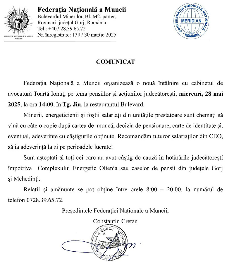 Astfel, Federația Națională a Muncii organizează o nouă întâlnire cu cabinetul de avocatură Toartă Ionuț, pe tema pensiilor și acțiunilor judecătorești, miercuri, 28 mai 2025, la ora 14:00, în Tg. Jiu, la restaurantul Bulevard.