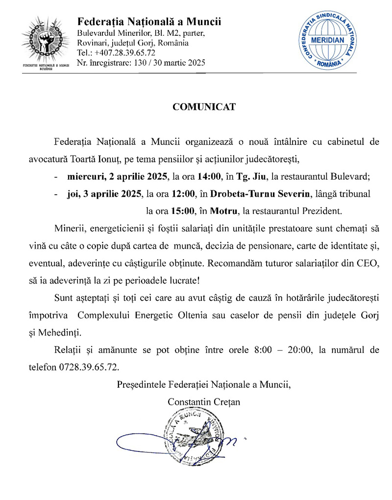 Recomandăm tuturor salariaților din CEO, să ia adeverință la zi pe perioadele lucrate! Sunt aşteptați şi toți cei care au avut câştig de cauză în hotărârile judecătoreşti împotriva Complexului Energetic Oltenia sau caselor de pensii din județele Gorj şi Mehedinți”, a precizat liderul FNM, Constantin Crețan.