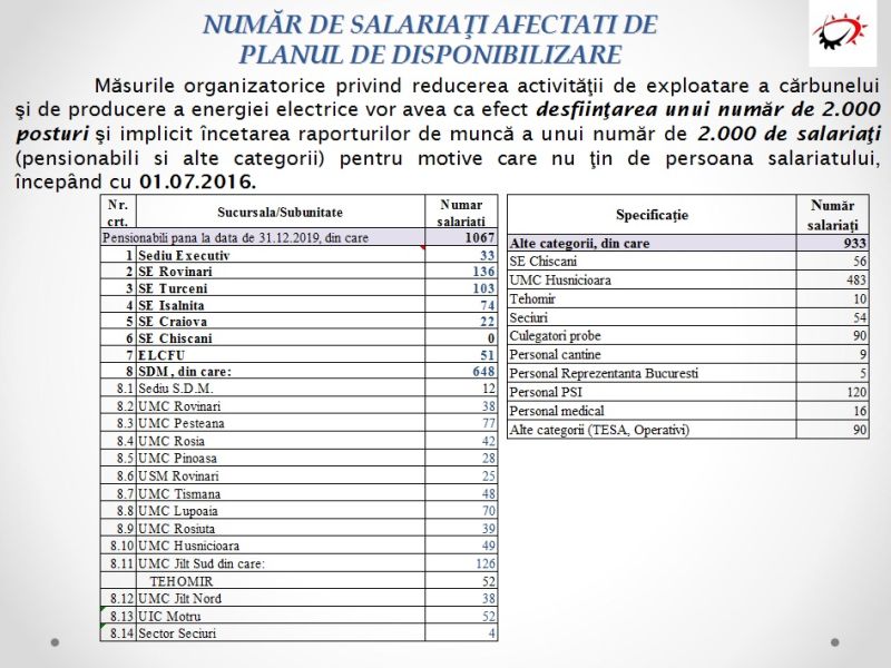 Liderii sindicali prezenți, ieri, la comisia mixtă restrânsă administrație-sindicate au fost înștiințați în legătură cu planul de eficientizare și reorganizare a Complexului Energetic Oltenia pe următorii patru ani, plan ce va fi supus aprobării AGA a CEO pe 20 mai. Proiectul, bătut în cuie de către administrație în acord cu solicitările Ministerului Energiei, prevede reduceri drastice de personal și activitate minieră în zona Gorjului. În primă fază, adică până pe 1 iulie vor fi disponibilizați primii 2000 de salariați, ca numărul să crească progresiv în anii următori, prin desființarea de entități miniere. Sindicaliștii au aflat că prima intrată pe picior de desființare va fi UMC Husnicioara, ce va fi urmată de carierele Motru, Roșiuța și Lupoaia, ca în final unitățile din Jilț să aibă aceeași soartă. Cel mult 6000 de angajați va mai număra în 2020 actualul CEO, potrivit acestui plan ce va fi supus aprobării forului de conducere la scurt timp după Paște.