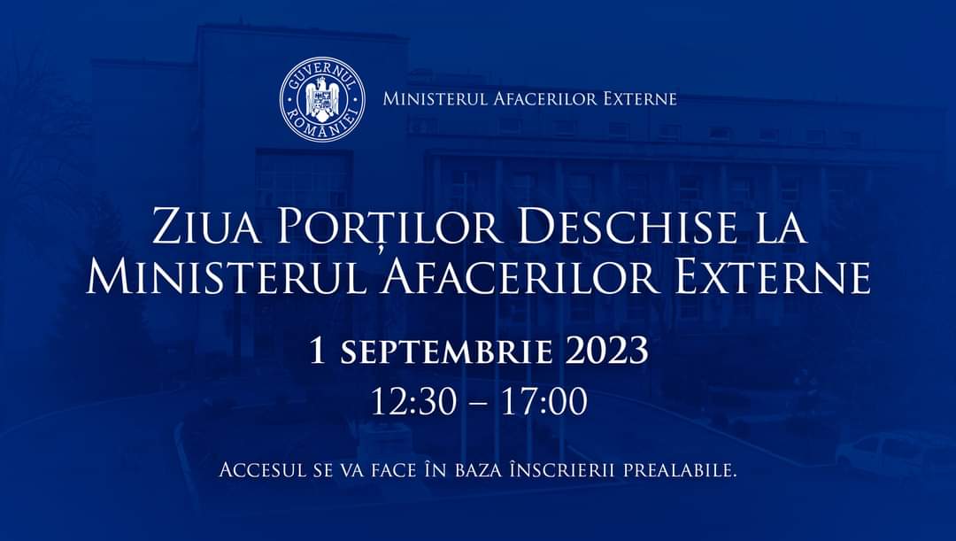 Ministerul Afacerilor Externe organizează vineri, 1 septembrie 2023, o nouă ediție a Zilei Porților Deschise, marcând astfel Ziua Diplomației Române și contribuția Corpului Diplomatic și Consular la dezvoltarea României şi la promovarea intereselor statului român în plan internațional.