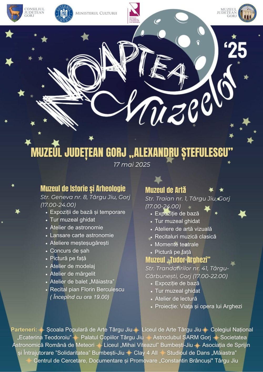Muzeul Județean Gorj „Alexandru Ștefulescu” vă așteaptă la Noaptea Muzeelor, sâmbătă, 17 mai 2025, în cele trei secții care vor fi deschise, cu activități foarte atractive și variate: