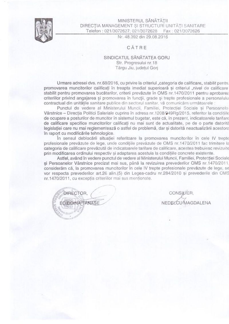 Potrivit conducerii Sindicatului “Sănătatea” Gorj, HG 286/2011, Titlul II, Promovarea în grade sau trepte profesionale imediat superioare a personalului contractual din sectorul bugetar plătit din fonduri publice și Regulamentul de organizare și desfășurare a examenelor de promovare în grade sau în trepte profesionale, aprobat prin act administrativ al ordonatorului principal de credite nu prevede condiții specifice sau speciale pentru anumite categorii profesionale, în speță bucătari, muncitori și așa mai departe. “De aceea, noi am solicitat răspunsul Direcției Generale de Resurse Umane, Juridic și Contencios din cadrul Ministerului Sănătății în vederea evitării unor conflicte de muncă iminente, având în vedere blocajul existent în procedura de promovare a muncitorilor, pornind de la refuzul unităților sanitare de a promova această categorie profesională pe motiv că nu îndeplinește condițiile stabilite de OMS 1470/2011, respectiv nu au dovada susținerii și promovării în categorie sau nivel profesional”, menționează Măruță.