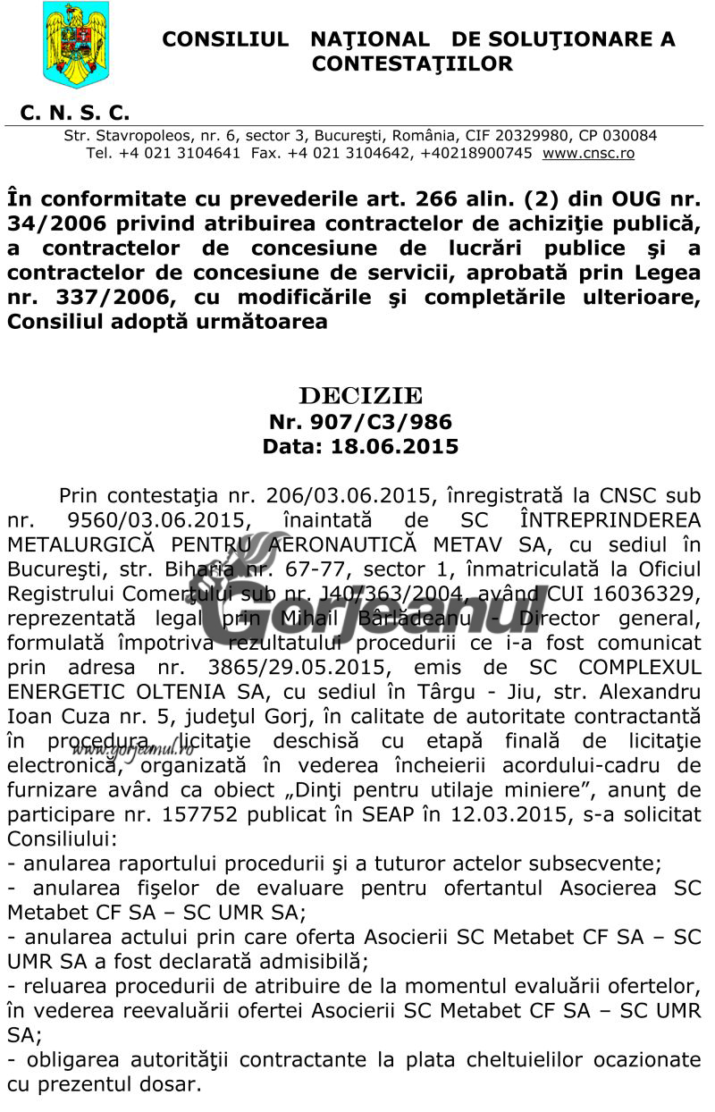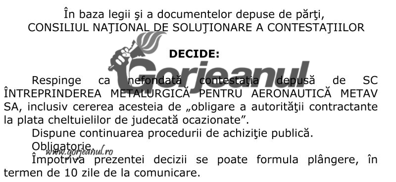 Pentru că fostul furnizor de dinți, INTREPRINDEREA METALURGICĂ PENTRU AERONAUTICĂ METAV S.A, este scos din schemă la licitația respectivă, firma din București contestă licitația la CNSC. Pe 18 iulie 2016, la două zile înainte ca UMR să intre, oficial, în insolvență, METAV primește decizia neașteptată a Consiliului Național de Soluționare a Contestațiilor(CNSC) care îi respinge cererea. METAV SA solicitase anularea raportului procedurii și a tututor actelor subsecvente licitației, anularea fișelor de evaluare a ofertantului Asocierea SC METABET SA-UMR SA, anularea actului prin care oferta celor două firme asociate a fost declarată admisibilă, reluarea procedurii de atribuire de la momentul evaluării ofertelor celor doi ofertanți și obligarea CEO la plata cheltuielilor ocazionate de acest dosar.
