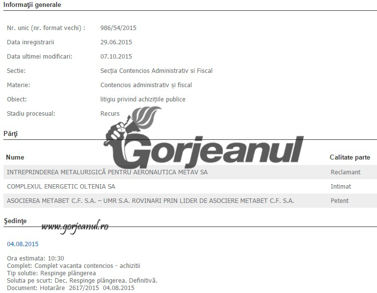 De altfel, pe 29 iulie, METAV SA, prin directorul său general Mihai Bîrlădeanu, mută litigiul pe rolul Curții de Apel Craiova, instanță care pe 4 august 2015 îi respinge însă, definitiv, plângerea. Din acel moment, pe contract-cadru, în baza licitației deschise cu etapă finală licitație electronică, finalizată însă prin semnarea contractului-cadru, rămâne să fie dus la îndeplinire, fără niciun fel de grețuri de firma aflată deja în insolvență UMR și de firma celor doi piteșteni, condamnați deja pe fond pentru corupție la 2 ani și opt luni cu suspendare și la prestarea a 120 de zile muncă în folosul comunității.