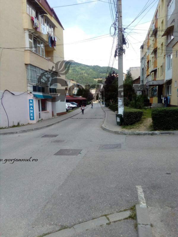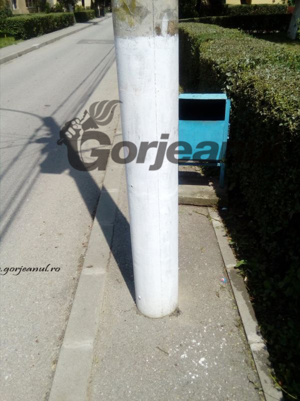 Minunile din Bumbești-Jiu: Pe strada Jiului, trotuarul este ocupat de stâlpi, iar o alee lărgită între blocuri are bariere cu lacăt și o singură cheie