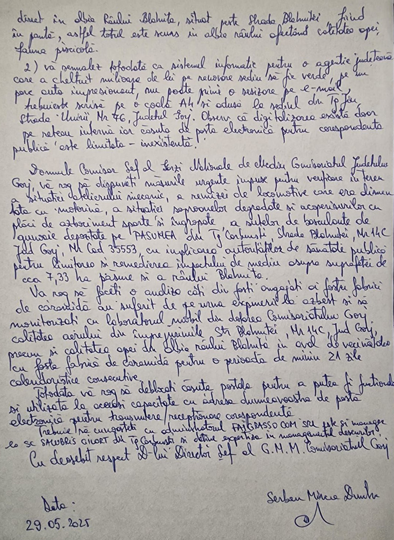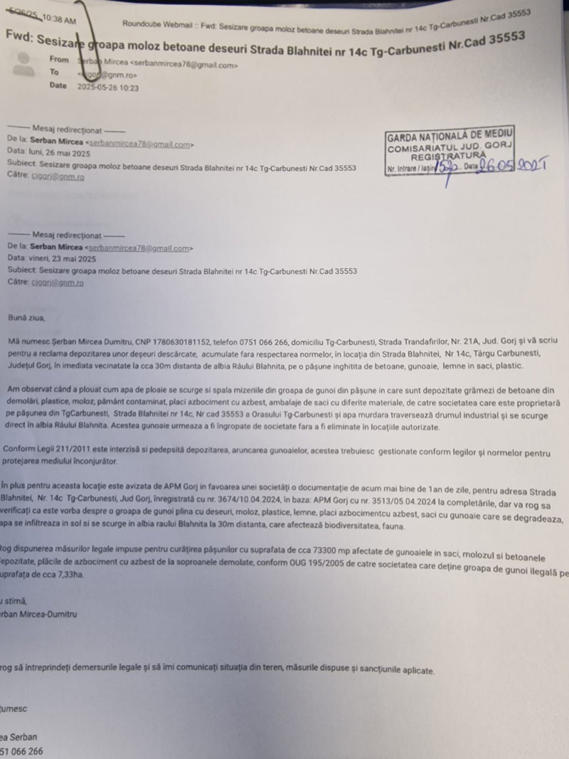Mircea Șerban a făcut, numai în ultima perioadă, numeroase sesizări la Garda de Mediu Gorj, pentru care a primit doar câte un număr de înregistrare și atât.