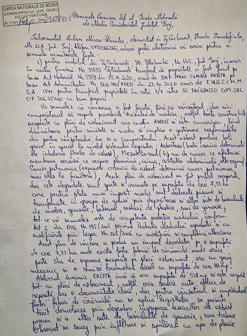 Acest lucru este contrazis acum de sesizarea oficială transmisă de Mircea Șerban, care atrage atenția că terenul este contaminat și nu poate fi folosit legal pentru construcții până nu este decontaminat în mod corespunzător.