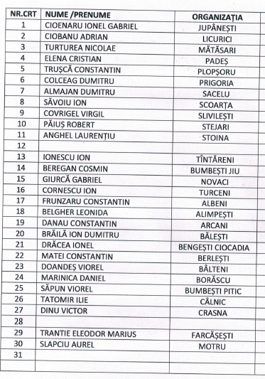 pentru Novaci, Frunzaru Constantin pentru Albeni, Dănău Constantin pentru Arcani, Ionel Drăcea pentru Bengești-Ciocadia, Constantin Matei pentru Berlești, Viorel Doandeș pentru Bîlteni, Daniel Marinică pentru Borăscu, Ilie Tatomir pentru Cîlnic, Victor Dinu de la Crasna și Trantie Eleodor Marius la Fărcășești. Cei 28 au fost validați de BPJ-ul Mișcării Populare Gorj într-o ședință care a avut loc la finalul săptămânii trecute.