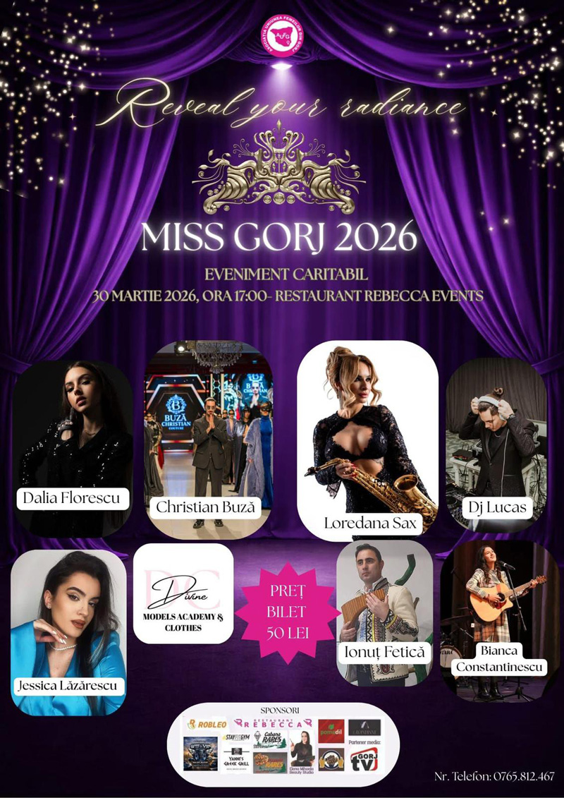 Pe scenă vor urca artiști precum Dalia Florescu, Christian Buză, Loredana Sax, DJ Lucas, Jessica Lăzărescu, Ionuț Fetica și Bianca Constantinescu, care vor contribui la crearea unei atmosfere spectaculoase. Participantele la concurs vor defila în cadrul mai multor probe, într-un show care îmbină moda, muzica și eleganța, oferind publicului o experiență memorabilă. Evenimentul este organizat cu sprijinul partenerilor și sponsorilor locali care susțin dezvoltarea proiectelor culturale și caritabile din județul Gorj. Prețul unui bilet este de 50 de lei, iar fondurile obținute vor contribui la susținerea demersului caritabil al evenimentului. Organizatorii invită publicul, presa și toți susținătorii inițiativelor comunitare să ia parte la această seară specială, în care frumusețea și generozitatea se întâlnesc pentru o cauză nobilă.