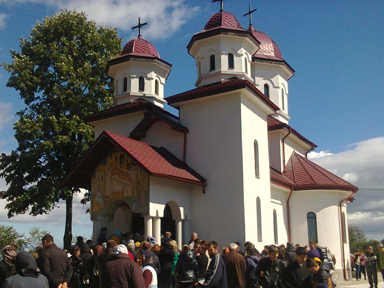 tale! Că, aşa cum spunem în Rugăciunea «Tatăl Nostru», «facă-se voia Ta!», dacă spunem cu tot dinadinsul aceste cuvinte, în mod sigur că Mântuitorul Hristos face din viaţa noastră un adevărat rai pe pământ! Aşa au fost sfinţii care i-au dăruit viaţa lui Dumnezeu şi au dobândit, în schimb, şi viaţa aceasta, dar şi viaţa veşnică! Sunt nenumărate modele de sfinţi pentru fiecare dintre noi şi putem să-i urmăm întotdeauna! Că zice Mântuitorul Hristos: «dacă cineva va dori ca să dobândească viaţa aceasta, o va pierde, iar, dacă cineva pierde viaţa aceasta pentru mine şi pentru Evanghelie, acela o va câştiga»! Vrea să spună că dacă ne îngrijim de viaţa aceasta, în mod sigur, vom muri cândva! De multe ori, ne chinuim aici să facem case, să adunăm avere, iar, toate acestea, poate vor rămâne la nişte oameni care nu ne-au iubit niciodată! Aşadar, a ne lepăda de lucrurile acestea şi a veni la biserică, înseamnă să ne construim o viaţă frumoasă şi binecuvântată de Dumnezeu, o viaţă plăcută Mântuitorului Iisus Hristos, care ne va binecuvânta atunci când vom trece din viaţa aceasta, că ne spuneDomnul: «veniţi la mine, binecuvântaţii Tatălui meu, de moşteniţi Împărăţia cerurilor»! Pe cei care îi va binecuvânta Mântuitorul Hristos, acelora le va da ca să moştenească viaţa veşnică! Aşadar, biserica este locul răsplătirii, este locul dăruirii, este locul hranei noastre duhovniceşti! De aici primim hrană de la Tatăl Cel ceresc, că aşa ne spune Sfânta Scriptură: «Hrană poporului său, Domnul va da şi va binecuvânta poporul său cu pace»! Deci, Evanghelia de astăzi, care este aşezată după Sărbătoarea Sfintei Cruci, ne îndeamnă pe fiecare dintre noi să cugetăm, să privim cu atenţie la Sfânta Cruce, să ne închinăm întotdeauna şi să-L preamărim pe Dumnezeu în viaţa noastră, să nu uităm niciodată că trebuie să biruim cu Sfânta Cruce toate poftele acestea lumeşti şi trecătoare! Numai culegând aceste vlăstare curate în viaţa noastră, putem să aducem un dar pentru bogăţia Lui Dumnezeu! Deci, în primul rând, cei care s-au ostenit pentru construirea acestei sfinte biserici, vor afla răsplată în ceruri! Că zicem la rugăciune: «Binecuvintează, Doamne, pe cei ce iubesc frumuseţea Casei Tale»! Aşadar, cei care au înfrumuseţat această sfântă biserică, Dumnezeu îi va răsplăti şi le va da cele folositoare în locul celor pământeşti! Şi dumneavoastră, cei care aţi venit la Sfânta Liturghie şi aţi luat parte cu atenţie la sfânta slujbă, veţi primi răsplată de la Cel ceresc, pentru că El este milostiv şi iubitor de oameni, pentru că El nu rămâne niciodată dator nouă! Să nu-i uităm pe cei care au contribuit la această frumoasă zidire! De aceea, ne rugăm Bunului Dumnezeu să le dăruiască, în locul celor pământeşti, cele cereşti! Îi felicităm pe toţi şi Dumnezeu să vă dea sănătate şi multă bucurie de la Mântuitorul Iisus Hristos! Amin”!