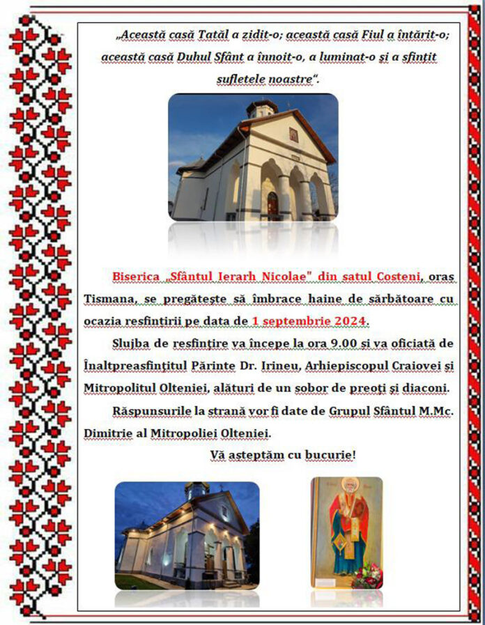 Biserica ce poartă hramul Sfântul Ierarh Nicolae din Costeni – Tismana va fi resființită în prima zi a lunii septembrie, aici fiind așteptați sute de localnici și nu numai. Lăcașul de cult a fost modernizat în ultimele luni, iar acum îmbracă haine de sărbătoare, la slujba de sfințire fiind așteptat chiar Mitropolitul Olteniei, Înaltpreasfințitul Irineu. Un sobor de preoți și diaconi vor oficia la slujba respectivă, la care va fi prezent și primarul Narcis Petre Remetea, fiu al satului.