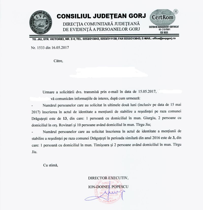 Cele spuse de Moșoiu se confirmă dacă ne gândim că Direcția Comunitară de Evidență a Persoanelor Gorj a confirmat luni, pentru Gorjeanul, că 13 persoane au cerut, în ultimul timp, viză de reședință în comuna Drăguțești. Comparativ cu aceeași perioadă a anului trecut, pentru Drăguțești au cerut viză doar trei persoane.