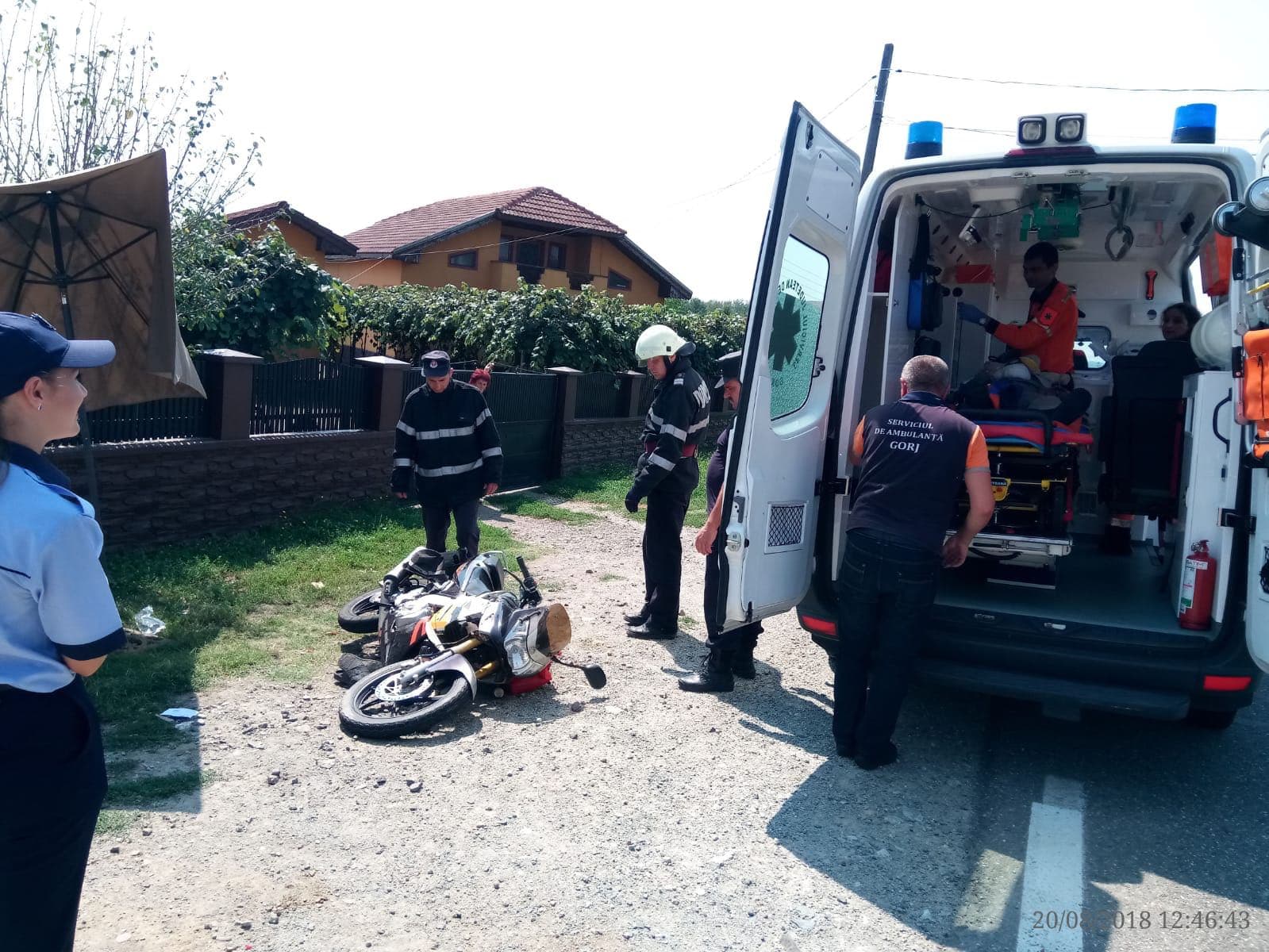 Un motociclist în vârstă de 73 de ani, din Motru, a fost rănit, ieri, în urma unui accident care s-a petrecut în localitatea Telești. Acesta nu ar fi păstrat distanța regulamentară și s-a oprit cu vehiculul în autoturismul din fața sa. ”Pe fondul neadaptării vitezei la condițiile de drum, acesta a intrat în coliziune cu un autoturism condus regulamentar”, a declarat Miruna Prejbeanu, purtătorul de cuvânt al IPJ Gorj. La fața locului au intervenit un echipaj SMURD și unul de la Ambulanță, care au decis ca victima să fie transportată la spital.