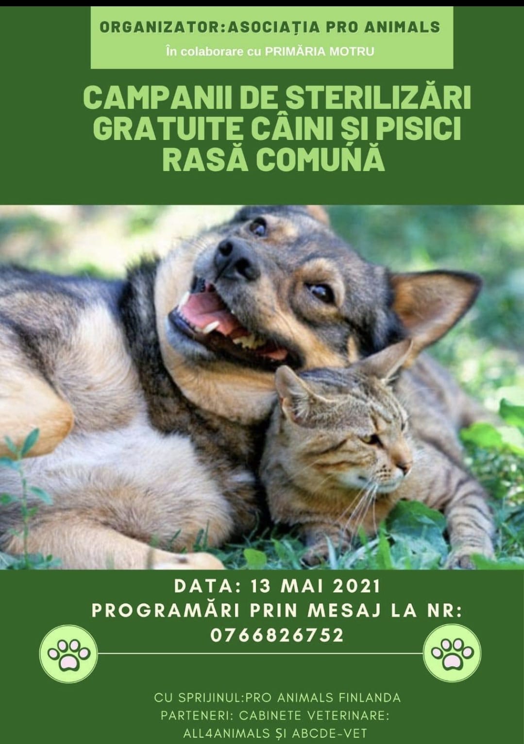 O nouă campanie de sterilizare gratuită a câinilor şi pisicilor de rasă comună va avea loc în municipiul Motru. Acțiunea este organizată de Asociatia Pro Animals, în data de 13 mai. Programări se pot face, prin sms, la numărul de telefon 0766/826.752.