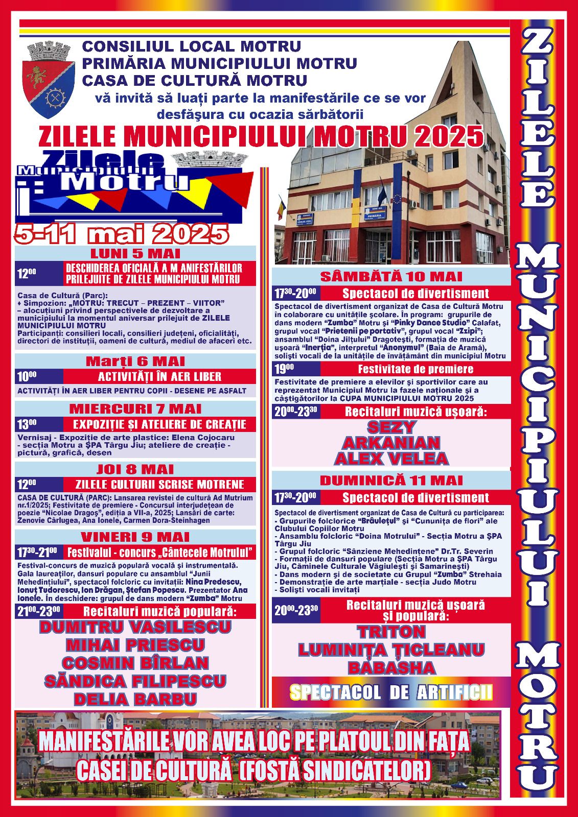 Primăria Municipiului Motru, Consiliul Local și Casa de Cultură îi invită pe toți cetățenii să participe la această sărbătoare dedicată comunității locale, care va avea loc pe platoul din fața Casei de Cultură (fosta clădire a sindicatelor). Programul este divers și accesibil tuturor categoriilor de vârstă, cuprinzând activități culturale, artistice, recreative și sportive.