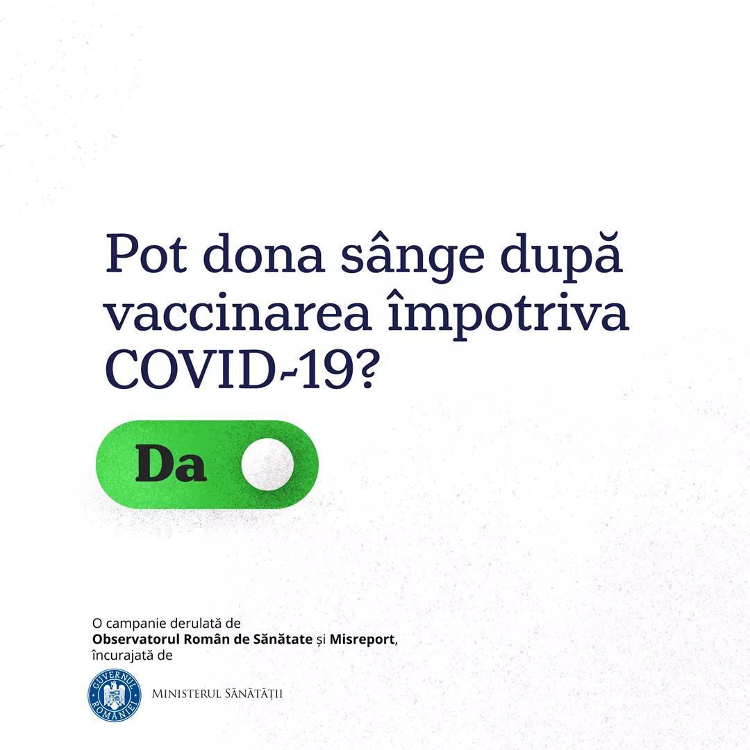 „Vaccinurile împotriva COVID-19 disponibile în România în acest moment, Pfizer BioNTech și Moderna, permit donarea de sânge imediat după vaccinare, fără o perioadă de așteptare. În momentul de față, România dispune de vaccinurile împotriva COVID-19 bazate pe tehnologia ARN-ului mesager. Molecula de ARN mesager nu prezintă potențial infecțios și este înlăturată din organism odată ce și-a îndeplinit scopul, acela de a produce proteina Spike care declanșează răspunsul imun. Chiar dacă suntem în mijlocul unei pandemii, nevoia de sânge a spitalelor rămâne constantă, și de aceea este bine să donăm sânge dacă îndeplinim condițiile obișnuite pentru a deveni donatori. Există posibilitatea programării de la distanță pentru donarea de sânge, telefonic, prin email sau prin intermediul unor aplicații mobile precum Donorium”, se arată într-o informare transmisă de Ministerul Sănătății.