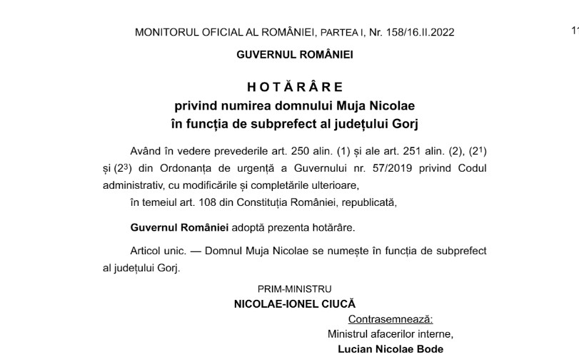 Nicolae Muja a fost numit subprefect de Gorj în ședința de miercuri a Guvernului. Hotărârea a fost publicată în Monitorul Oficial.