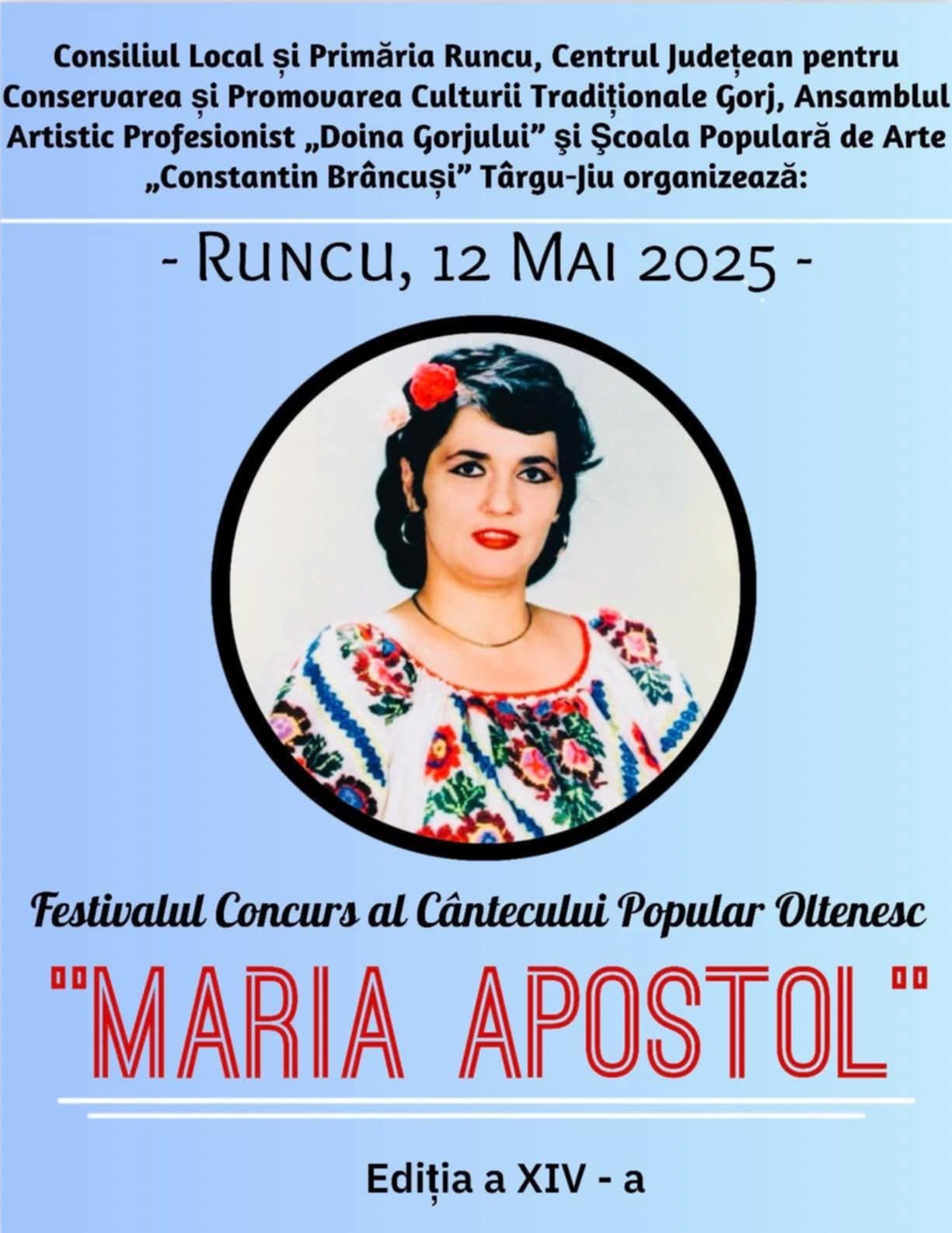 Festivalul „Maria Apostol” își propune să descopere și să promoveze tinerele talente autentice din folclorul oltenesc, aducând un omagiu uneia dintre cele mai iubite interprete ale muzicii populare românești”, au anunțat reprezentanții CJCPCT Gorj.