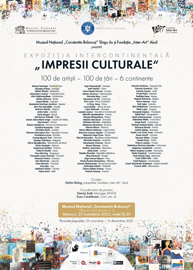 Potrivit conducerii instituției de cultură, manifestările cultural-artistice vor debuta în data de 25 octombrie, la ora 18:30 cu vernisajul expoziției intercontinentale ,,Impresii culturale”, ce cuprinde lucrări de artă plastică semnate de 100 de artiști din 100 de țări și 6 continente.