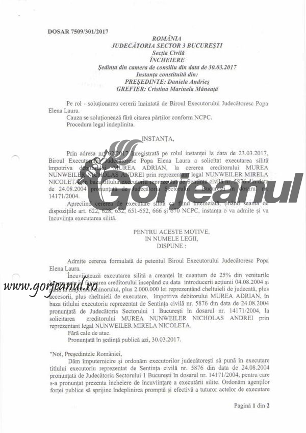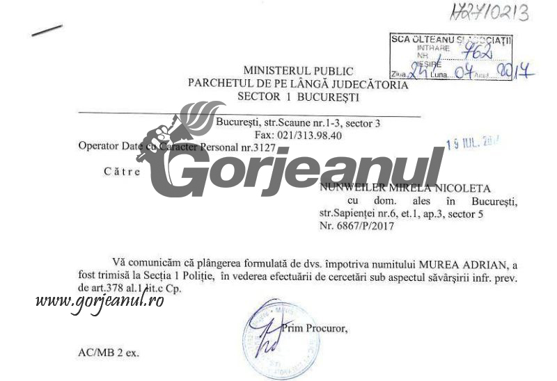 Trebuie menționat că pensia copilului a fost oprită anul trecut, când în septembrie Murea se suspendă din activitate de la Spitalul Gerota din Capitală și se angajează la Rovinari. Aici, după ceva timp, Murea devine manager, în timp ce își prelungește suspendarea de la Gerota. Între timp, promovarea lui Murea la Gorj se află în Capitală, iar Mirela Nunweiler ia urma celui care s-a sustras la plată, făcându-i și o plângere penală în acest sens. “Mă constitui parte civilă cu suma reprezentând contravaloarea pensiei de întreținere datorată de numitul Murea Adrian minorului MUREA-NUNWEILER NICHOLAS ANDREI și neachitată la data soluționării acestei plângeri. Voi preciza cuantumul exact al sumei pe parcursul urmăririi penale”, se arată în documentul înaintat Parchetului de pe lângă Judecătoria sectorului 1 București.