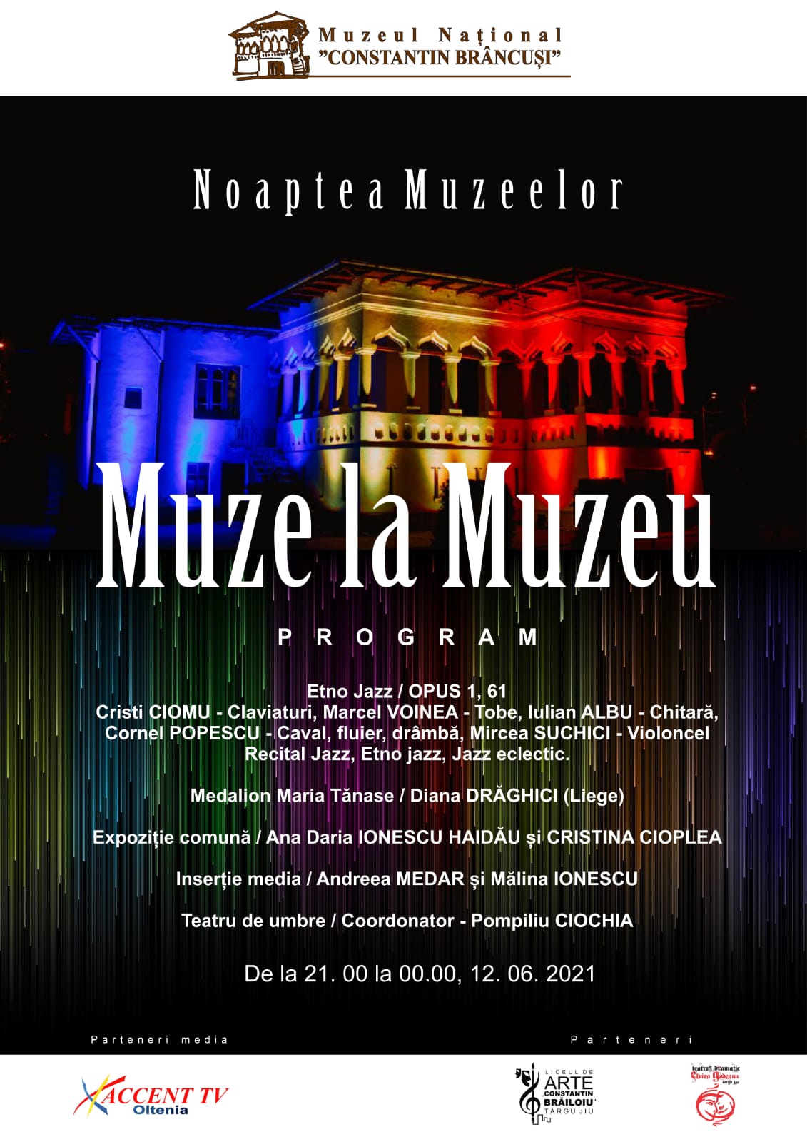„Sâmbătă, 12 iunie, între 21,00 și 00,00 vă așteptăm la Muzeul Național „Constantin Brâncuși”, la evenimentul „Muze la muzeu”, ocazionat de noaptea muzeelor. În programul evenimentului: recital de jazz, etno – jazz, jazz eclectic susținut de cvintetul OPUS 1, 61: Cristian Ciomu – claviaturi; Mircea Suchici – violoncel; Marcel Voinea – tobe; Iulian Albu-chitară; Cornel Popescu – caval, fluier, drâmbă; Medalion Maria Tănase – interpretare Diana Drăghici (Liege); Teatru de umbre – coordonator Pompiliu Ciochia, actor; Inserție video – Andrea Medar și Mălina Ionescu. Muzeul va găzdui expoziții personale de grafică și pictură aparținând artistelor Ana Daria Ionescu-Haidău și Cristina Cioplea”, anunță organizatorii.
