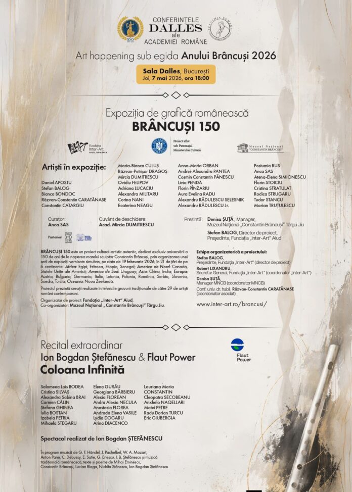 Muzeul Național „Constantin Brâncuși” din Târgu Jiu va participa la prestigiosul eveniment Conferințele Dalles, organizat sub egida Academiei Române, printr-un art happening dedicat Anului Brâncuși 2026. Manifestarea va avea loc joi, 7 mai 2026, de la ora 18:00, la Sala Dalles.