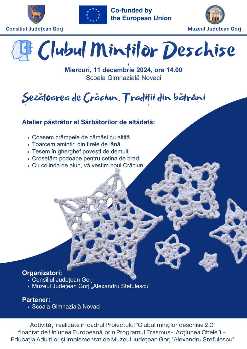 Activitățile sunt realizate în cadrul Proiectului ”Clubul minților deschise 2.0” finanțat de Uniunea Europeană, prin Programul Erasmus+, Acțiunea Cheie 1 – Educația Adulților și implementat de Muzeul Județean Gorj ”Alexandru Ștefulescu”.