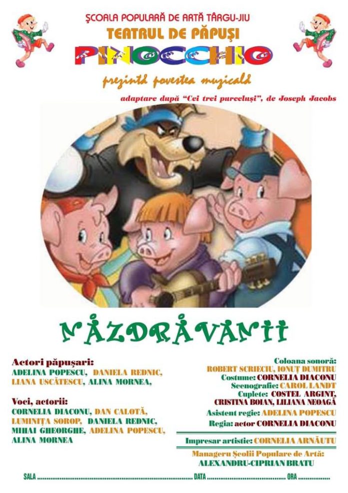 Copiii de toate vârstele sunt invitați duminică, 20 septembrie 2020, la Teatrul de Vară din Târgu Jiu, începând cu ora 11:00, la piesa ”Năzdrăvanii”, oferită de Teatrul de Păpuși ”Pinocchio”, din cadrul Școlii Populare de Artă Târgu Jiu. Intrarea este liberă! Dacă vremea va fi nefavorabilă, spectacolul va fi amânat și reprogramat ulterior.