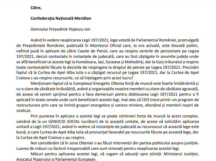 Federația Națională a Muncii, Uniunea Națională a Muncii – Oltenia, Uniunea Națională a Muncii – Valea Jiului și Liga Muncitorilor din România solicită Confederației Naționale Meridian să reclame la Ministerul Justiției, Avocatul Poporului și Parlamentul European, neaplicarea legii 197/2021.