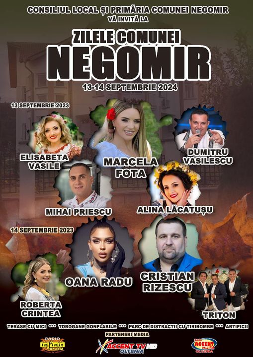 Primăria și Consiliul Local Negomir anunță că vineri și sâmbătă, 13 -14 septembrie 2024, va avea loc un spectacol cu mulți artiști îndrăgiți, dedicat evenimentului ,,Zilele Comunei Negomir”. Printre artiștii care vor urca pe scenă, se numără Alina Lăcătușu, Oana Radu, Marcela Fota, Cristian Rizescu. ”Vă așteptăm cu drag!”, a transmis localnicilor, și nu numai, primarul comunei Negomir, Tudor Oiță.
