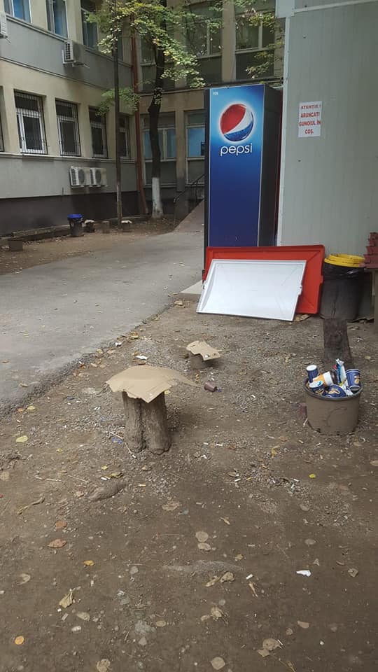 Buturugi acoperite cu cartoane, coșuri de gunoi făcute din găleți și lipsă de bănci ori tomberoane. Cu asta se laudă Spitalul Județean de Urgență Târgu-Jiu în curtea interioară a unității de urgență, transformat în loc de relaxare pentru pacienți și aparținători.