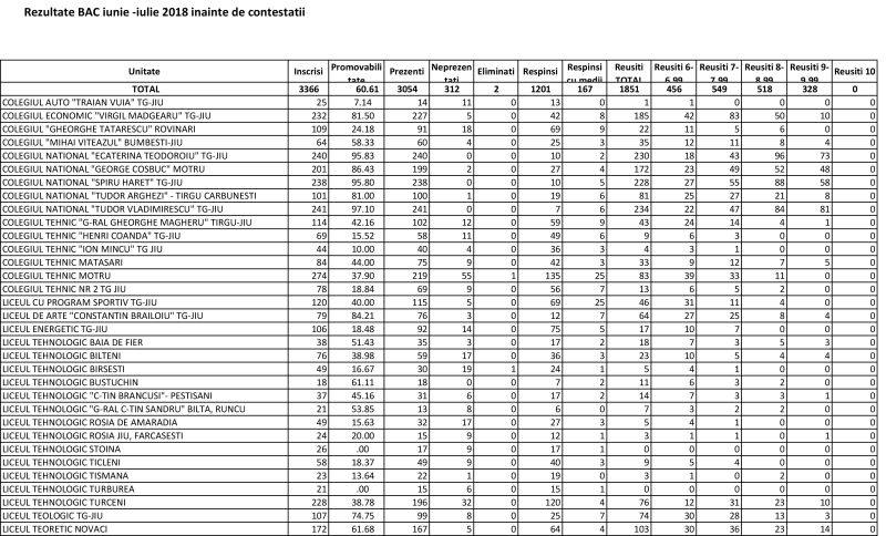 Aceasta a absolvit Colegiul Național ”Tudor Vladimirescu”, din Târgu-Jiu, care se află pe primul loc, cu o promovabilitate de 97,10 la sută. La polul opus sunt elevii de la două licee din județ, unde niciun candidat nu a promovat examenul de Bacalaureat: Stoina și Turburea. La Liceul Tehnologic Turburea, pentru al doilea an consecutiv, promovabilitatea este zero înainte de contestații, toți cei 15 candidați prezenți fiind respinși. ”Sunt trei sau patru copii care nu au picat la nicio materie, dar nu au obținut media generală 6. Vor face contestație. Oricum, vom face meditații toată vara cu ei”, a declarat Gheorghe Benegui, directorul liceului.