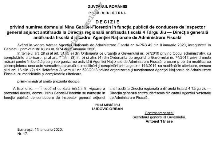 Florentin Gabriel Ninu a fost numit, luni, 13 ianuarie, în fruntea Direcței Regionale Antifraudă Târgu-Jiu. El l-a înlocuit pe Alin Eleodor Mihai, numit în funcție la sfârșitul lunii martie 2018.
