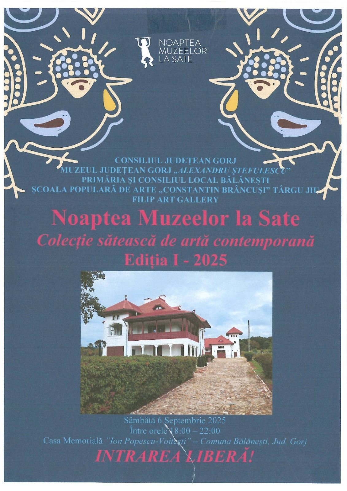 „Vă așteptăm într-un număr cât mai mare să ne vizitați și să vă bucurați alături de noi de prima ediție Noaptea Muzeelor la Sate – Colecție sătească de artă contemporană, Bălănești, Gorj, 6 septembrie 2025”, transmit organizatorii. Accesul este gratuit.