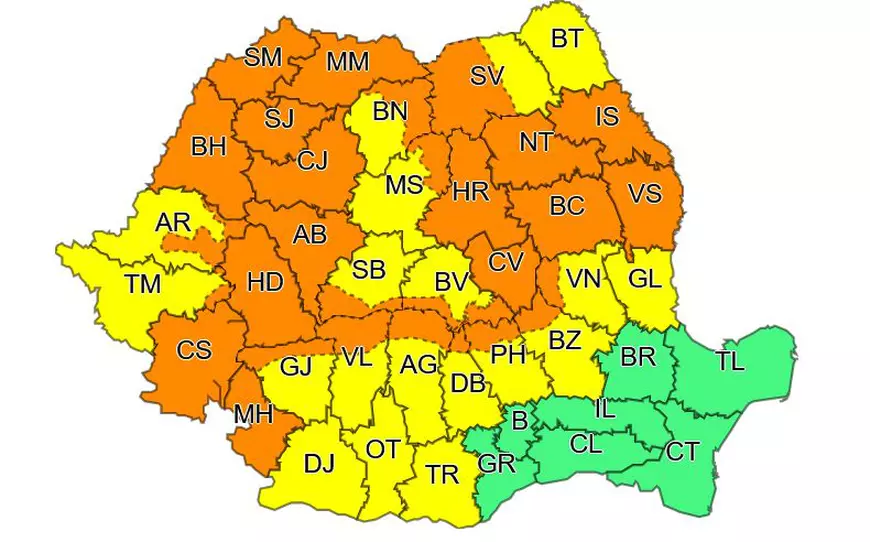 O avertizare cod portocaliu este în vigoare de astăzi, de la ora 14.00 și până vineri, la ora 2.00, și vizează zona de munte, sudul Banatului, nordul Crișanei, Maramureș, vestul și estul Transilvaniei, centrul Moldovei, precum și vestul Olteniei. În aceste zone „vor fi ploi torențiale, descărcări electrice, vijelii și grindină de medii dimensiuni,