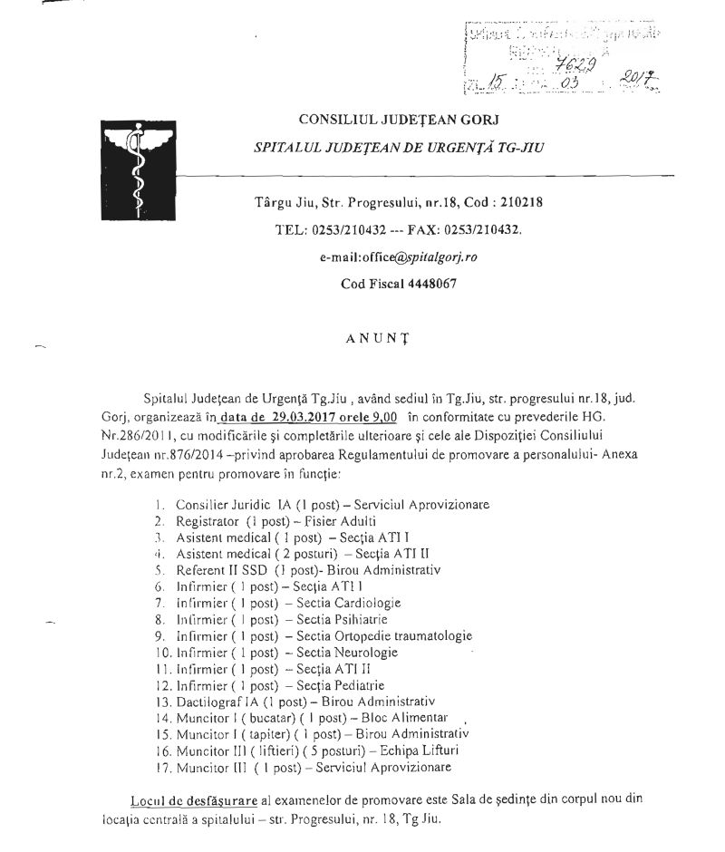 Spitalul Județean de Urgență Târgu-Jiu a organizat pe 19 martie un concurs de promovare în funcții pentru 17 salariați, de puțin timp angajați în unitatea medicală. Printre cei promovați se află și persoane despre care mass-media locală a relatat, cu ceva timp în urmă, că ar fi pilele unora dintre cei aflați în conducerea spitalului, plângeri legate de felul cum s-au angajat registratorii medicali ajungând chiar în fața procurorilor gorjeni.