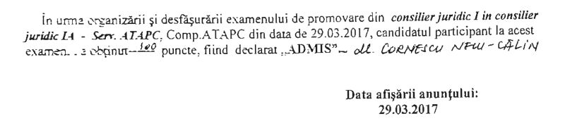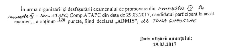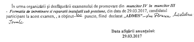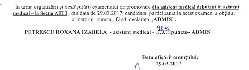 Afișarea rezultatelor la concursurile suținute de cei 17, arată că respectivii au fost extrem de bine pregătiți, punctajele necoborând sub 90, existând numeroși candidați care au luat chiar 100 de puncte. Este cazul juristului Cornescu Nelu-Florin, care a fost promovat din consilier juridic clasa I în consilier juridic clasa IA, a unuia dintre infirmierii debutanți de la Psihiatrie și a patru dintre muncitori. Restul candidaților au obținut 90 de puncte, mai puțin Petrescu Roxana Izabela, asistentă angajată anul trecut ca debutantă în Secția ATI, care a luat admis cu virgulă, adică 98,33 de puncte.