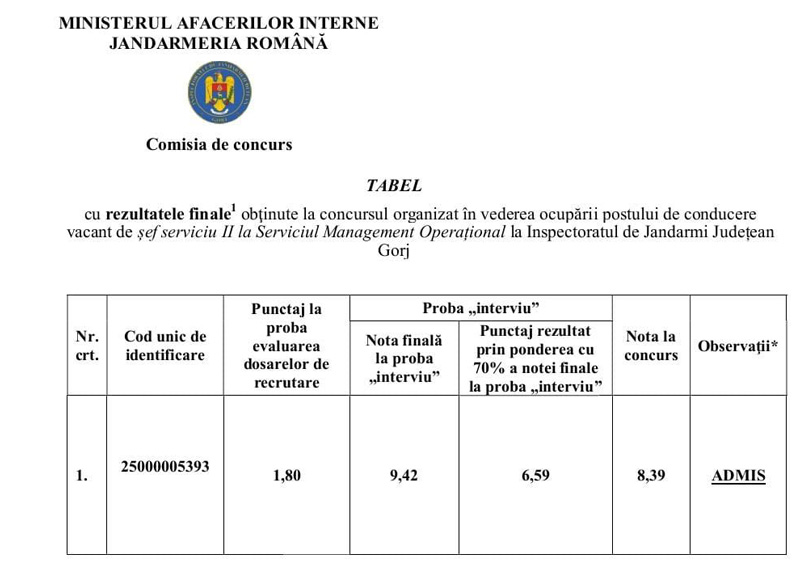 Singurul candidat care s-a înscris la concursul organizat de Inspectoratul de Jandarmi Județean Gorj, pentru o funcție de conducere, cea de șef serviciu II, la Serviciul Management Operațional, a fost declarat ,,admis”.