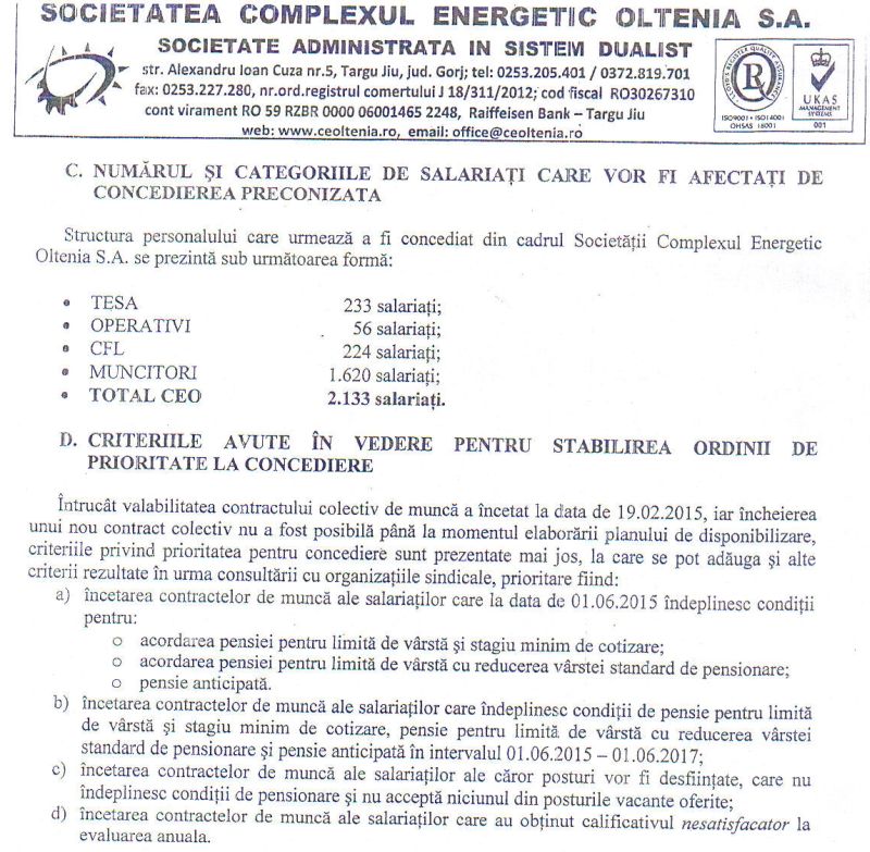 CEO a transmis, miercuri, sindicatelor din companie, o notificare care se întinde pe şase pagini, prin intermediul căreia organizaţiile erau anunţate astfel de intenţia administraţiei de a efectua concedieri colective începând cu data de 1.06.2015. În cuprinsul documentului se precizează că la complex prestează, în prezent, 18.424 de persoane, Executivul fiind format din 631, Activitatea Minieră fiind concentrată pe 11.817 de salariaţi, cea Energetică pe 5337 de angajaţi, dar şi pe “Alte Activităţi”, în care sunt angrenaţi însă 639 de muncitori. De altfel, în document sunt stipulate şi motivele care determină conducerea companiei să apeleze la concedierile colective, dar şi faptul că, “CE Oltenia trebuie să parcurgă un amplu proces de restructurare, atât din punct de vedere tehnologic, cât şi din punct de vedere al numărului de personal, în urma căruia vor rămâne în funcţiune doar capacităţile de producţie cele mai eficiente, atât în zona de energie, cât şi în zona de minerit”.