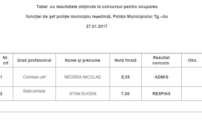 Noul șef al Poliției Târgu-Jiu a participat, vineri, la concursul pentru ocuparea funcţiei de şef al Poliţiei Municipiului Târgu-Jiu, cu recrutare din sursă internă, reușind să obțină nota 8.25. Proba a constat în susţinerea unui  interviu structurat pe subiecte profesionale. La concurs s-au înscris doi candidați. Subcomisarul Eugen Stan, contracandidatul său, a obținut nota finală 7, fiind declarat ”respins”.  Nicolae Negrea a fost  împuternicit comisar şef de Poliţie, în 2016, după ce Mihai Birău a ieșit la pensie.  (L.F.)