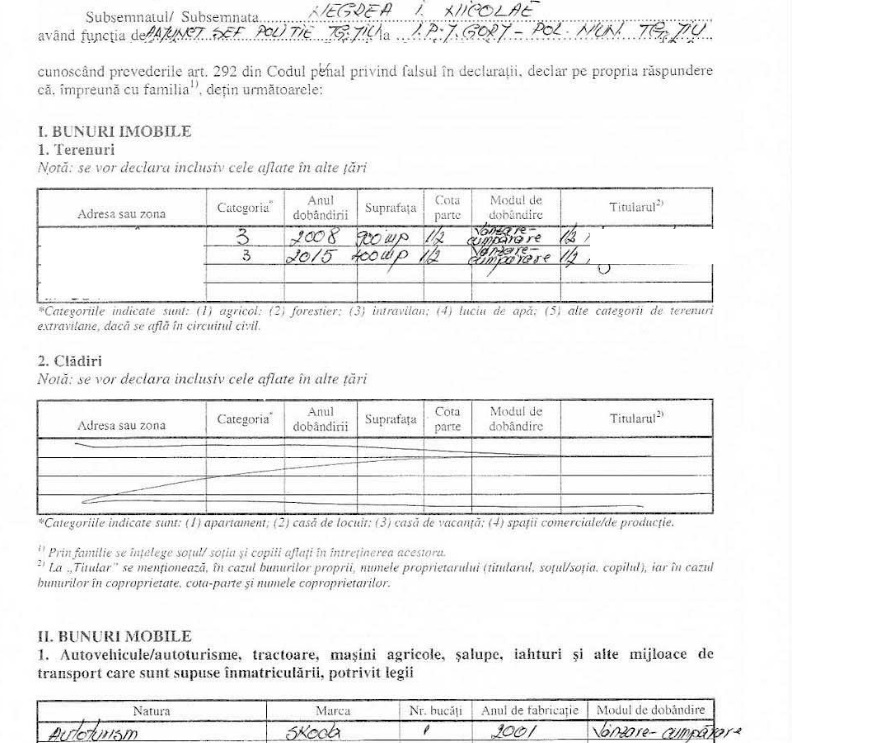 Conform declarației de avere, completată pe 9 martie 2016, noul șef al Poliției Târgu-Jiu, Nicolae Negrea, cel care a condus instituția și în 2016, în regim de interimat, deține o cotă de 1/2 din două terenuri intravilane, unul achiziționat în anul 2008 și celălalt în 2015, dar și un autoturism SKoda, fabricat în anul 2001. Venitul anual încasat a fost în valoare de 65.001 lei, fiind vorba despre perioada în care era adjunct al șefului Poliției Târgu-Jiu. Documentul arată că Nicolae Negrea nu deține nicio clădire și nu a contractat credite. Potrivit unor surse din cadrul IPJ Gorj, acesta ar locui într-un imobil închiriat, în municipiul Târgu-Jiu.
