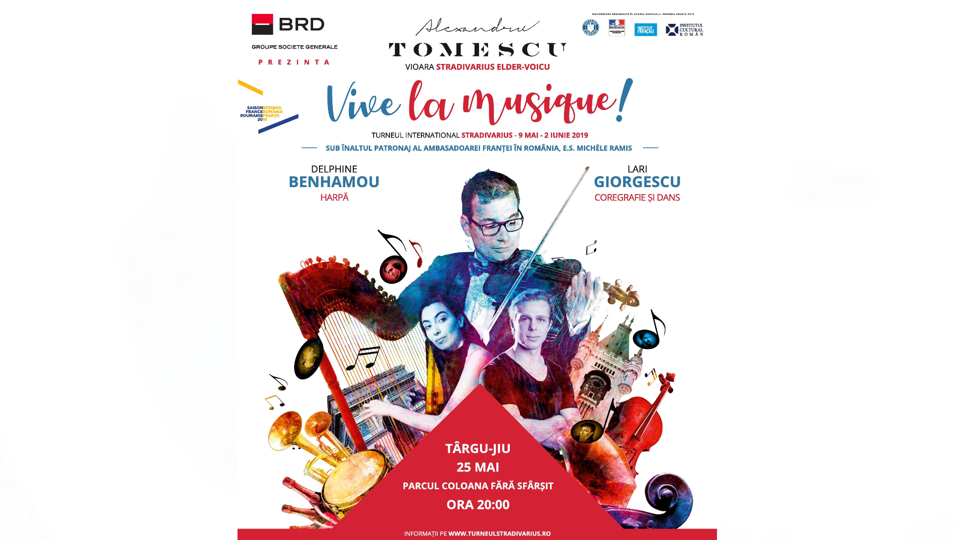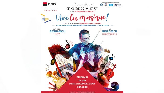 Primăria Municipiului Târgu Jiu, prin Direcția Turism și Evenimente Culturale și Centrul Național de Informare și Promovare Turistică „Constantin Brâncuși” vă invită sâmbătă, 25 mai, începând cu ora 20:00, în Parcul Coloanei Fără Sfârșit din Târgu Jiu, la un nou concert de excepție oferit de violonistul Alexandru Tomescu în cadrul turneului Stradivarius 2019. Conceput de virtuozul Alexandru Tomescu, acest turneu excepțional propune publicului din România o întâlnire între compozitori clasici și contemporani, francezi și români, într-un dialog inedit între vioara lui Alexandru Tomescu, harpa lui Delphine Benhamou și mișcarea coregrafică a lui Lari Giorgescu, toate reunite într-un spectacol sincretic și original.