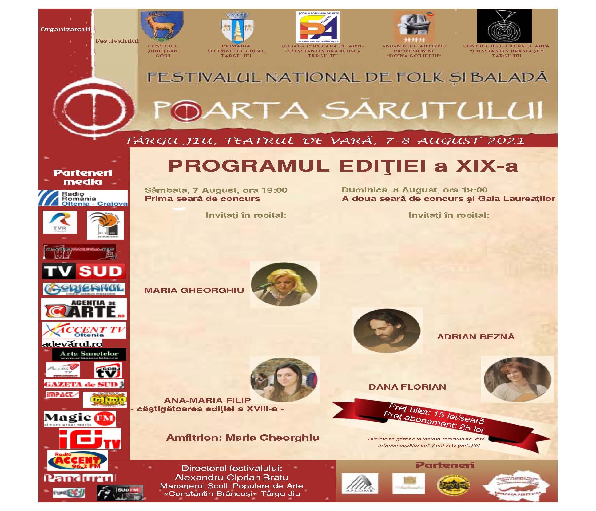 Nume mari ale folkului românesc vor urca și anul acesta pe scena Festivalului Național de Folk și Baladă ”Poarta Sărutului”, au anunțat organizatorii. ”În perioada 7-8 august se va desfășura cea de-a 19-a ediție a Festivalului Național de Folk și Baladă ”Poarta Sărutului”. Timp de două zile, capitala folkului se va muta în orașul lui Brâncuși și va aduce pe scenă noi talente și nume mari ale folkului românesc. Festivalul-concurs este un eveniment cu tradiție, un eveniment competitiv organizat de Școala Populară de Arte ”Constantin Brâncuși”, Consiliul Județean Gorj, Primăria și Consiliul Local Târgu-Jiu, Centrul de Cercetare, Documentare și Promovare ”Constantin Brâncuși”, Ansamblul Profesionist ”Doina Gorjului”, în colaborare cu posturi de radio și televiziuni locale și naționale. Acest eveniment are ca scop descoperirea și promovarea a noi talente interpretative și de creație ale muzicii folk. Programul festivalului promite a fi și anul acesta unul de excepție. Sâmbătă, 7 august, ora 19.00, va avea loc tradiționalul concurs de muzică, iar după concurs vor încânta și încălzi publicul Maria Gheorghiu, Dan Vană, Mircea Rusu și Ana-Maria Filip, câștigătoarea ediției trecute. Duminică, 8 august, ora 19.00, continuă competiția muzicală dintre tinerii interpreți, iar după concurs vor intra în atmosfera de poveste creată de vocile calde ale interpreților Dana Florian, Adrian Beznă, Emeric Imre și Mircea Vintilă”, a anunțat Anamaria Alionescu, purtătorul de cuvânt al Școlii Populare de Arte ”Constantin Brâncuși”. Festivalul se va desfășura la Teatrul de Vară ”Nelu Dumitru” din Târgu-Jiu. Prețul unui bilet este de 15 lei, iar prețul unui abonament este de 25 lei. Intrarea este liberă pentru copiii cu vârsta de până la 7 ani.