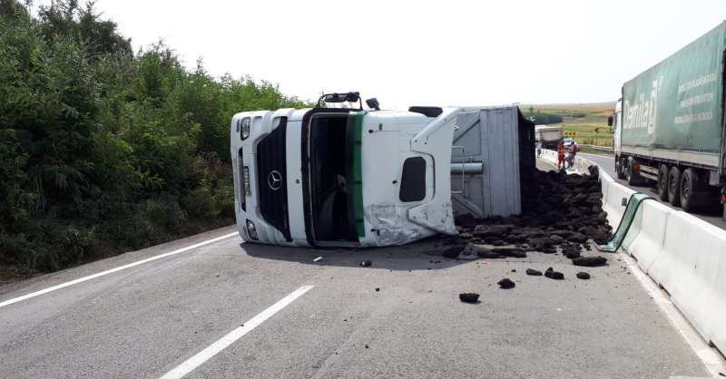 Circulaţia a fost blocată, luni după-amiază, pe DN 65, la km 17, în dreptul localităţii Pieleşti, judeţul Dolj, pe sensul către Balş, după ce o basculantă cu cărbune a intrat în balans şi s-a răsturnat. Potrivit IPJ Dolj, un pasager care se afla în basculanta condusă de un bărbat de 54 de ani din Bâlteni, judeţul Gorj, a fost rănit uşor şi a fost transportat la spital. Circulaţia în zonă s-a desfăşurat, mai mult timp, pe un singur sens, după ce o parte din cărbunele din basculanta răsturnată s-a împrăştiat pe carosabil şi s-a oprit în separatorul de beton dintre sensuri. Poliţiştii au stabilit că şoferul nu consumase băuturi alcoolice. La faţa locului s-a deplasat şi un echipaj al Detaşamentului 2 Pompieri Craiova.