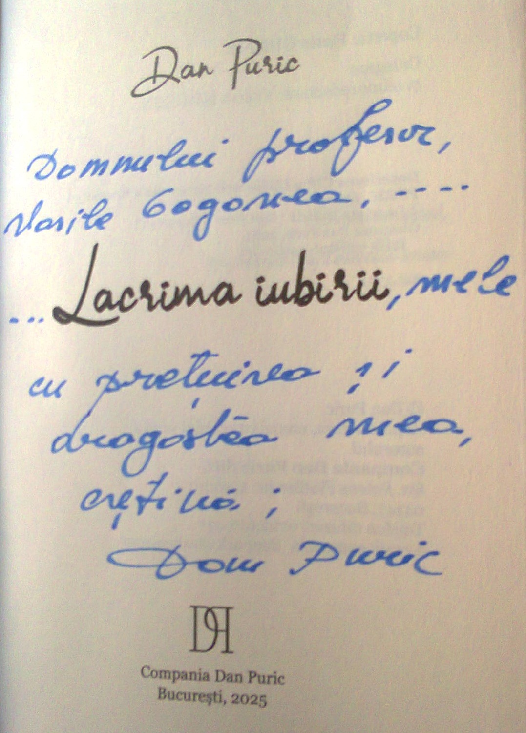 Când i-am promis ceva domnului Dan Puric, m-a străbătut un fior de împreună datorie şi responsabilitate, pentru că un asemenea om se află mai rar în zilele noastre, dar, dincolo de orice apreciere bazată pe cultivarea insistentă a pragmatismului şi de sublinierea mohorâtă a pesimismului, rămâne chipul emblematic al unui om care întreabă mereu sfinţii, dacă se împacă întotdeauna cu sfinţenia lor! Cartea aceasta minunată, intitulată «Lacrima iubirii», merită să fie citită de către românul care visează la ceva mai bine pentru viitorul apropiat şi la ceva mai relevant pentru trecutul îndepărtat, fără a avertiza inflexibil asupra unor controverse ocazionale şi fără a escamota perspectiva orizontului consensual! Domnul Dan Puric vorbeşte «despre adevărata putere a iubirii» cu dezinvoltura scriitorului de cuvinte şi cu măiestria actorului de dincolo de scenă, pentru că «Dragostea JERTFĂ» transcende ideilor care vin din cărţi, iar anii cei care îi preced au o cerinţă primordială care înseamnă studiul atent şi aprofundat al miezului cuvintelor…potrivite! Ştiu din propria experienţă că şcoala nu produce nici talente, nici oameni cu suflet deosebit, ci, oameni care visează la viaţă, însă, ea ne şlefuieşte abilităţile, ne responsabilizează, ne deschide noi orizonturi şi ne pregăteşte un viitor mai bun la care domnul Dan Puric visează, mai ales că orice formă de educaţie este o cerinţă fundamentală!