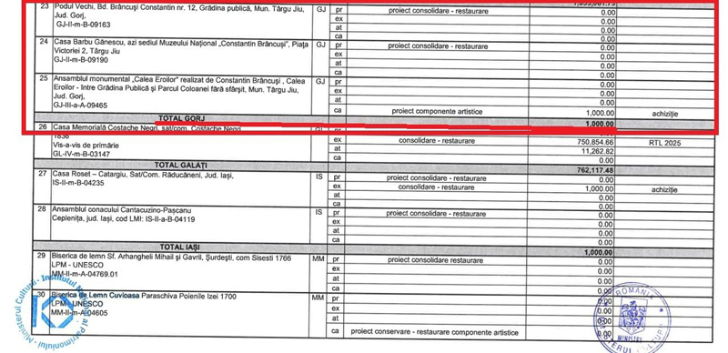 Bătaia de joc este cu atât mai mare cu cât, cu doar trei zile înainte de vizita la Târgu Jiu, pe 25 martie, aceleași doamne Intotero și Zaharia semnaseră ,,Programul Național de Restaurare – Etapa I – 2025”. Ghiciți ce sumă a fost alocată pentru Ansamblul Monumental ,,Calea Eroilor” în acest program! 1.000 de lei! O mie de lei pentru conservarea și restaurarea unei opere de artă de o valoare inestimabilă, un simbol național și universal.