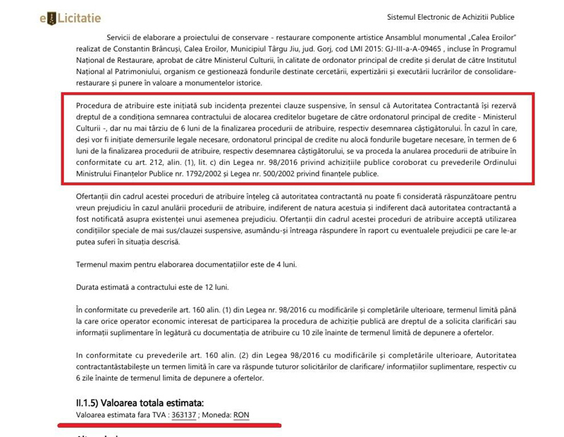 De ce se întâmplă asta? Cauza principală este incredibil de simplă și de revoltătoare: nu există fondurile necesare pentru acest contract! Da, ați citit bine. Deși valoarea estimată a contractului este de 363.137 de lei – o sumă infimă prin comparație cu importanța patrimonială a Ansamblului Brâncuși de la Tg-Jiu, Institutul Național al Patrimoniului (INP) a specificat că procedura de atribuire este inițiată sub incidența unei ,,clauze suspensive”. Ce înseamnă asta în limbaj comun? Că INP își rezervă dreptul de a condiționa semnarea contractului de alocarea creditelor bugetare de către ordonatorul principal de credite, adică de către Ministerul Culturii, adică de instituția condusă de Intotero. Mai mult, dacă în termen de șase luni de la finalizarea procedurii de atribuire Ministerul Culturii nu alocă fondurile, procedura va fi pur și simplu anulată.
