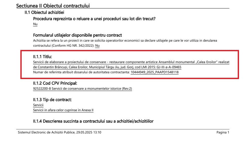 Ei bine, ,,concursul de soluții” mult trâmbițat nu a avut loc niciodată. În schimb, pe 2 iunie, o nouă procedură a fost lansată în sistemul electronic de achiziții publice (SEAP): un alt anunț de participare, cu același scop – elaborarea proiectului de conservare și restaurare a Ansamblului Brâncuși. Termenul limită pentru depunerea ofertelor este miercuri, 18 iunie, și, cu tristețe, se poate anticipa același deznodământ: cel mai probabil, nici de această dată nu vor fi depuse oferte. De altfel, nicio firmă specializată nu a cerut clarificări, absolut nimic nu s-a mișcat pe SEAP de la momentul publicării anunțului, în condițiile în care mai sunt două zile până expiră termenul limită.